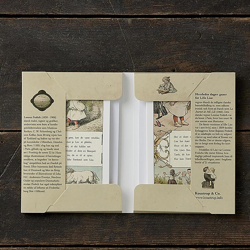 Hvorledes dagen gaaer for Lille regnes blandt de tidligste danske børnebilledbøger, men udkom ironisk nok først på fransk som La Journeé de Mll. Lili (1862). Den danske tegner Lorenz Frølich var da bosat i Paris, hvor han snart fik stor succes som illustrator. De første versioner af lille Lise var i sort-hvid, men i 1889 bestilte forlæggeren Ernst Bojesen Frølich til at udarbejde en helt ny udgave i farver og med tekst af Ernest vor der Reche. Det er denne udgave, der er brugt som forlæg for kortmappen.
