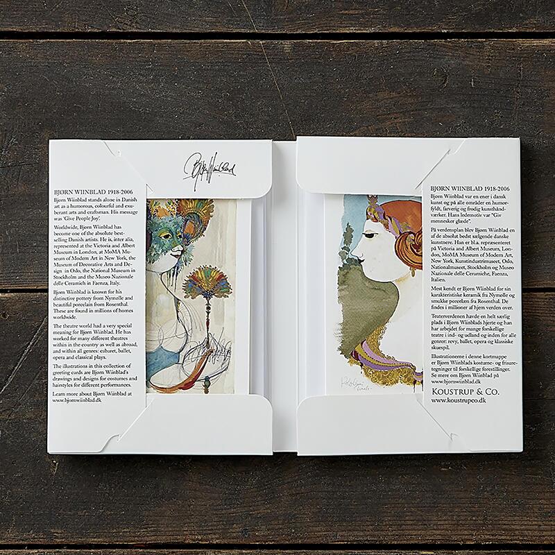 Kvalitetskort med motiver af kostume- og frisure-tegninger illustreret af Bjørn Wiinblad.