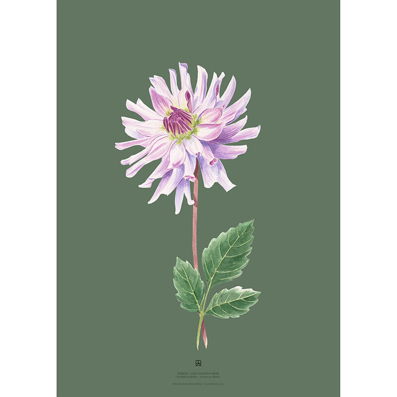 Smukt kunstprint af med den skønne dahlia "Leila Savanna Rose" i fine rosa, pink og lilla nuancer på grøn baggrund. Motivet er tegnet af kunstner Helene Højlund Kejser.