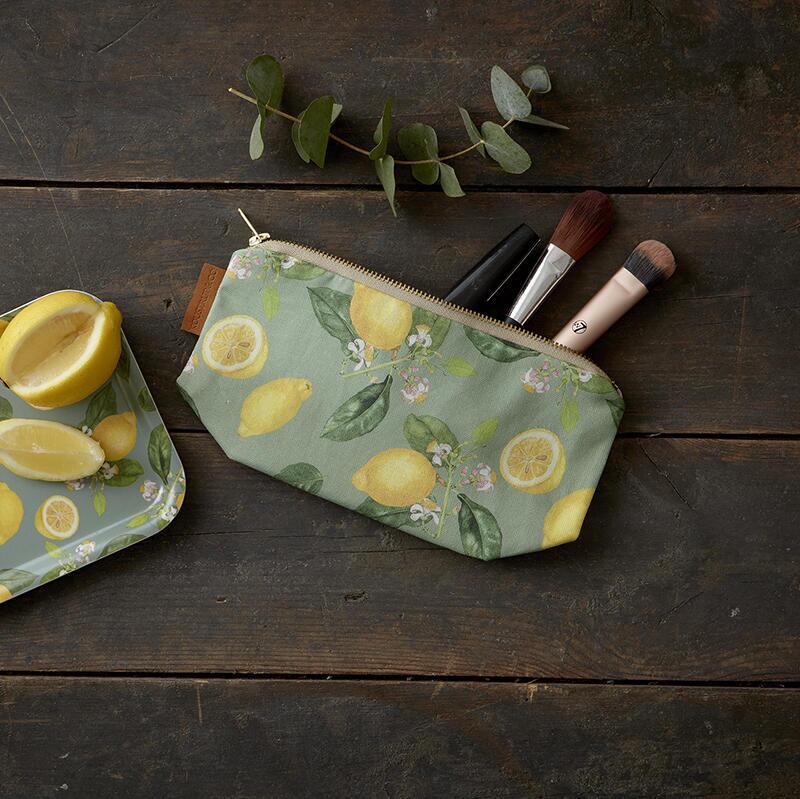 Pungen er grøn med friske gule citroner. Grønt og hvidt mønstret inderfoer. Kosmetiktasken har metallynlås, som gør tasken mere holdbar.