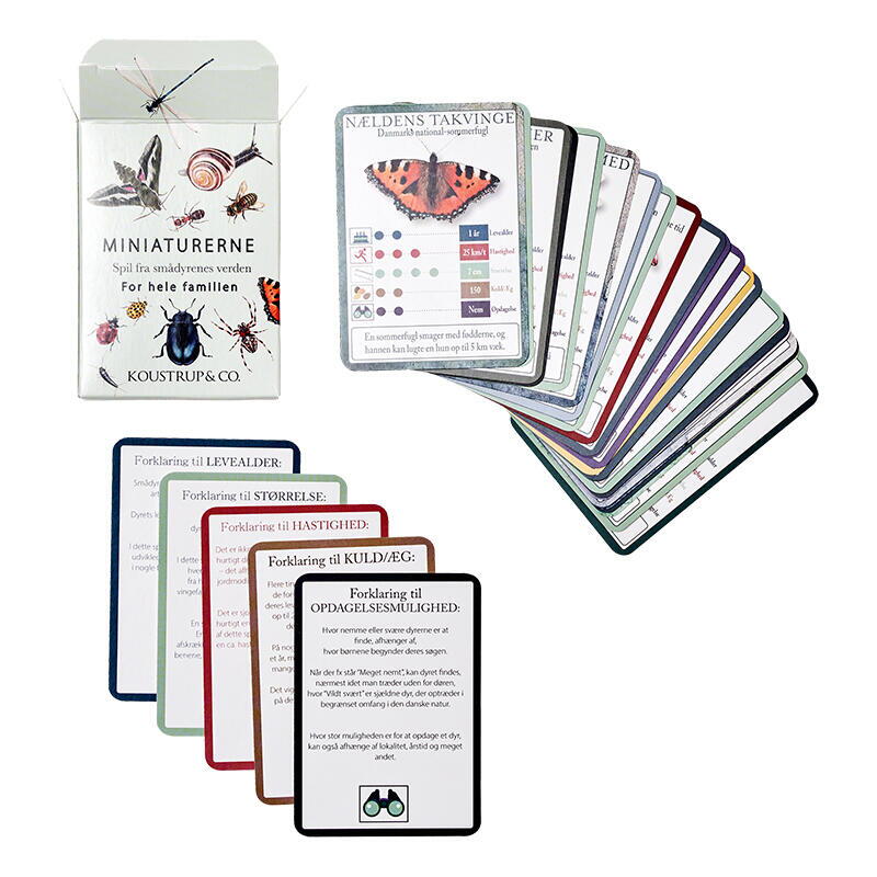 Med dette nye kortspil med idé fra Kenneth Lenander og illustrationer fra Lykke Bianca bliver du klogere på de allermindste dyr - miniaturerne - som kribler og krabler rundt i haven, i skoven og på legepladsen. Alle kort har nemt aflæselige ikoner og prikker, der gør, at børn helt ned til treårsalderen kan dyste mod hinanden uden voksen-indblanding. Kortenes sjove facts gør spillet interessant og er et lærigt spil for både børn og voksne og kan spilles af alle familiens medlemmere.