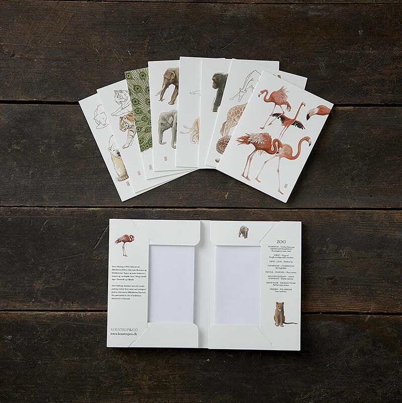 Quality cards with 8 different zoo animals illustrated by Steen Malberg.