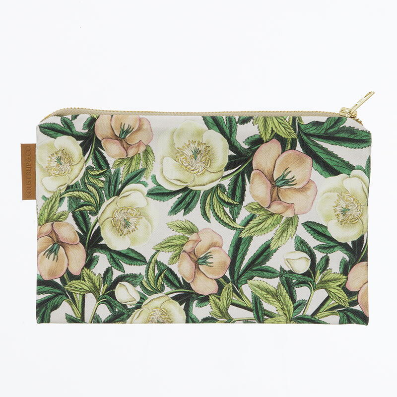 Økologisk kosmetiktaske til makeup, til tandbørsten, mobiltelefonen og ear plugs, som toilettaske, kosmetikpung eller penalhus. Smukt illustreret med juleroser/påskeklokker