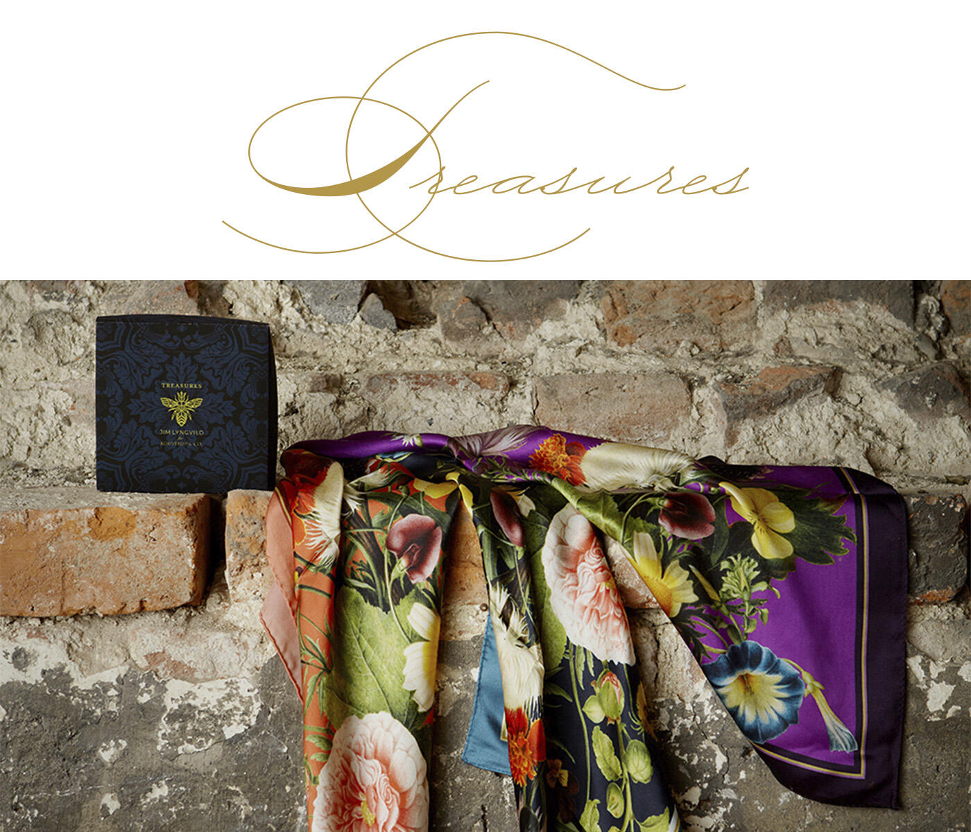 Kollektionen indeholder også smukke silketørklæder med botaniske blomstermotiver, samt Jim Lyngvilds overdådige konger og dronninger fra den danske historie