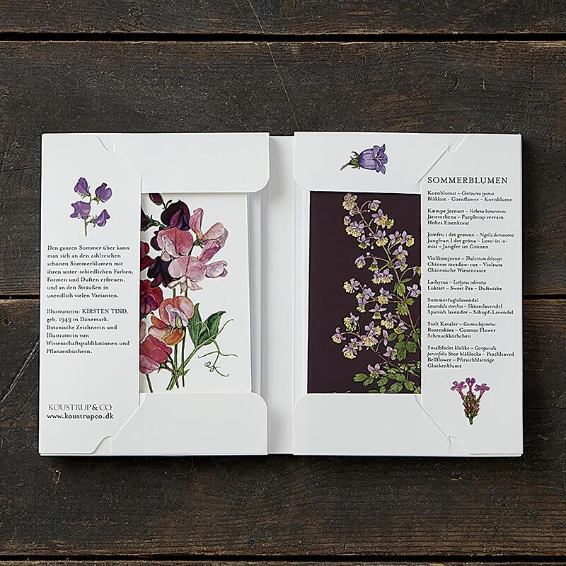 Kortmappen indeholder 8 kuverter og 8 forskellige dobbeltkort med sommerblomster. Illustreret af Kirsten Tind.