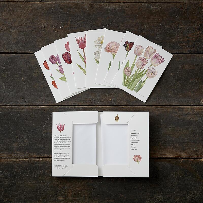 Der Kartenordner enthält 8 Umschlage und 8 verschiedene Doppelkarten mit Tulpen Motiven.